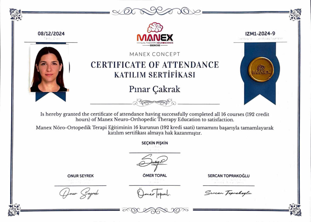 Nöro-ortopedik yaklaşım konsepti olan MANEX Manuel Terapi eğitimi ve Nöroloji ve kas-iskelet sistemini bütünleştirici bir yaklaşımı olan IKN APPROACH eğitimini aldım.