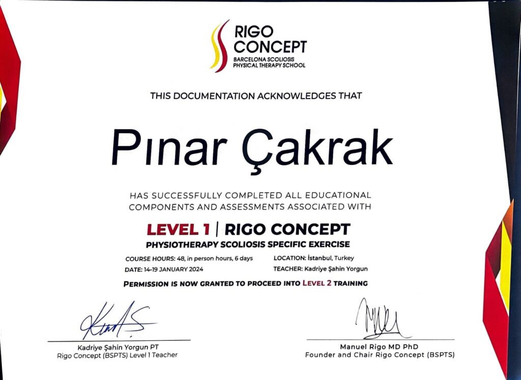 Skolyoza özel bir yaklaşım olarak, uluslararası geçerliliği olan Rigo Concept BSPTS – SCHROTH eğitimini tamamladım.